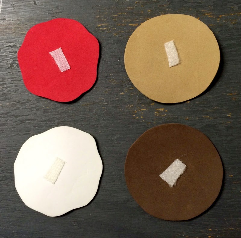 These sugar cookies were a bit more involved (but still very easy). First I cut circles out of tan foam (for sugar cookies) and out of dark brown foam (for chocolate cookies). On each of the circles I put a square of sticky-back velcro.