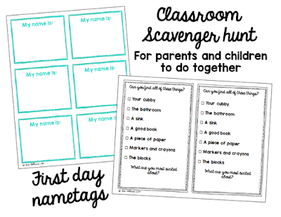 Easy name tags give children the opportunity to practice writing their names, while also helping you get to know their names. There is also a simple classroom scavenger hunt to encourage children and parents to explore the classroom and find the things that they will both need to be familiar with, like the child’s cubby and the bathroom.