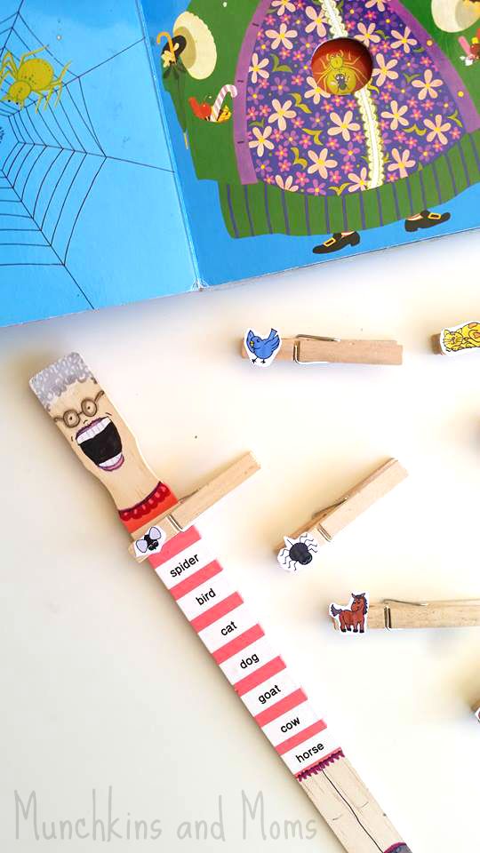 The “There Was an Old Lady” books have a rhyming structure and repetitive story that children can easily follow along with. Try this activity so children can follow along.
