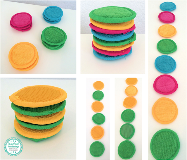 In addition to patterning, these are perfect for sorting by color. How else could you use these facial scrubbers in your math center?! Check back tomorrow for some more great (and cheap!) math ideas!