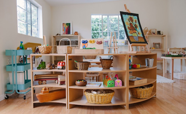 These bare walls feel anything but institutional – and I have that exact teal cart in my home, but that’s not the point… Kids Collective Preschool