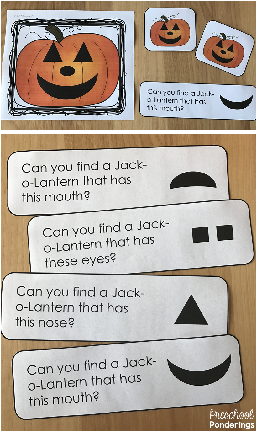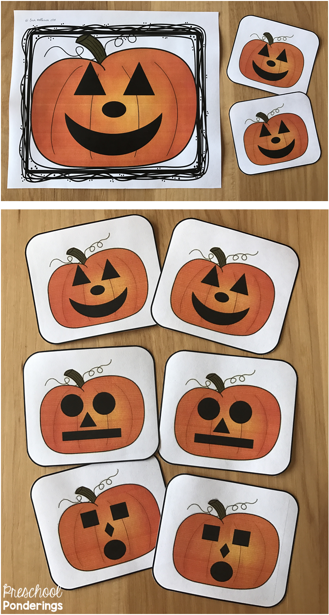 Children can use the shapes to make any face they wish, or they can recreate the inspiration cards by recognizing the shapes that have been used, finding them, and placing them in the proper locations on the Jack-o-Lantern.