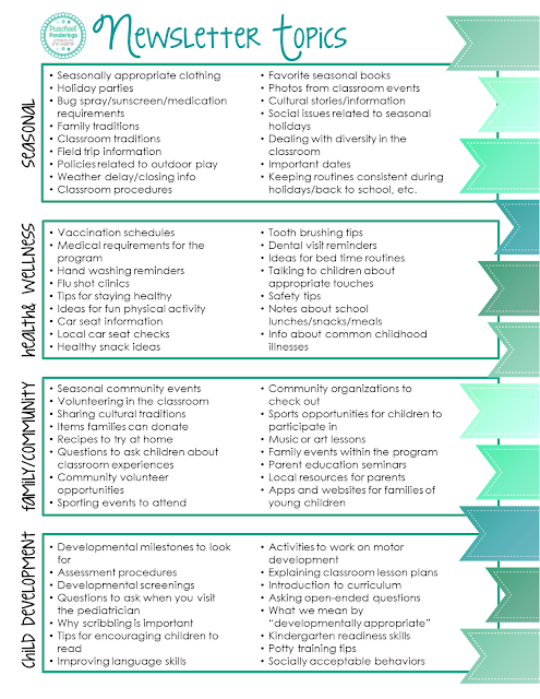 I also try to mix up the categories that I share from so that throughout the year families are getting just a little info from each topic. Not only has this list made it so much easier for me to write my newsletters, but it has made the newsletters themselves more valuable to my families. It is more than just a list of important dates and reminders of upcoming fundraisers. Now my newsletters include topics that are meaningful and helpful to the parents of children in my class. While I can’t guarantee that they read them every single month, I know that I’ve done my part to make them more interesting and helpful!